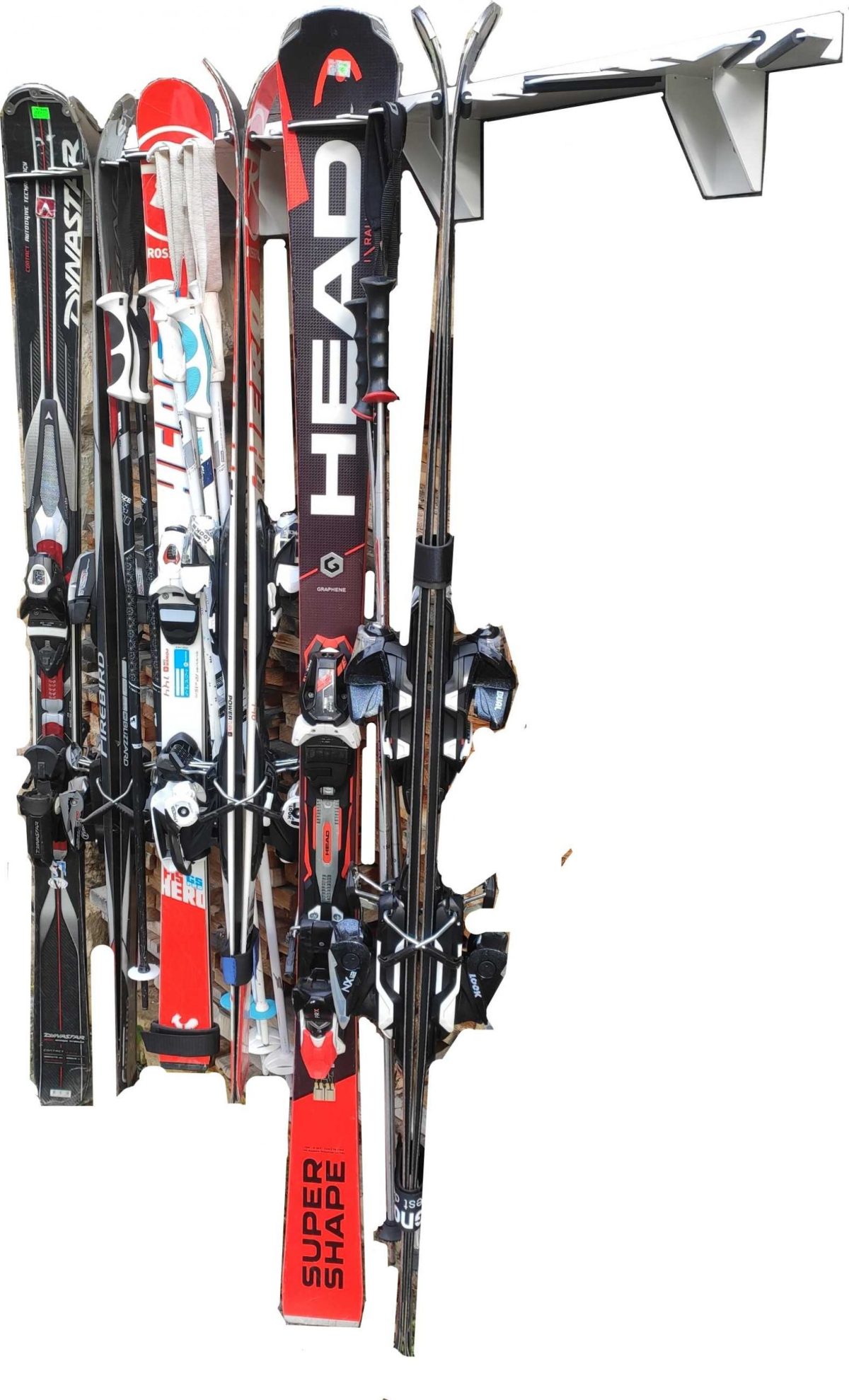 Praktický držák na lyže (6 párový) značky POHNER pro svislé uložení lyží. Šetří místo, chrání hrany lyží, umožňuije údržbu podlahy pod lyžemi a nabízí integrovanou polici pro rukavice a další vybavení.